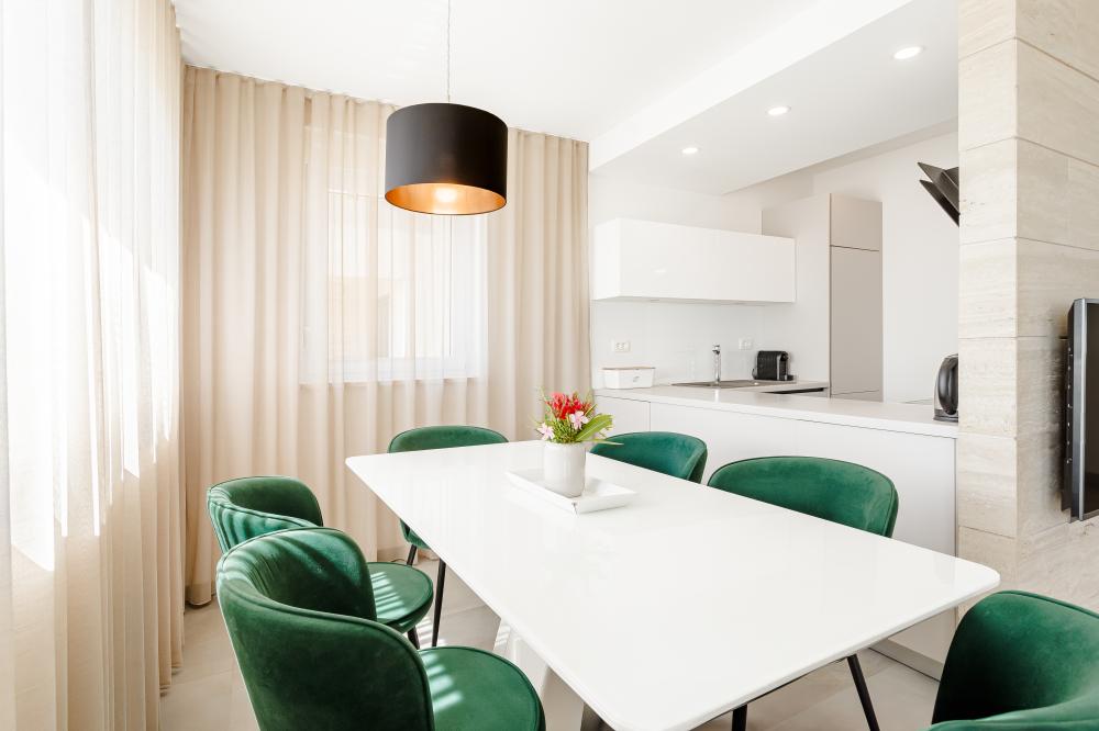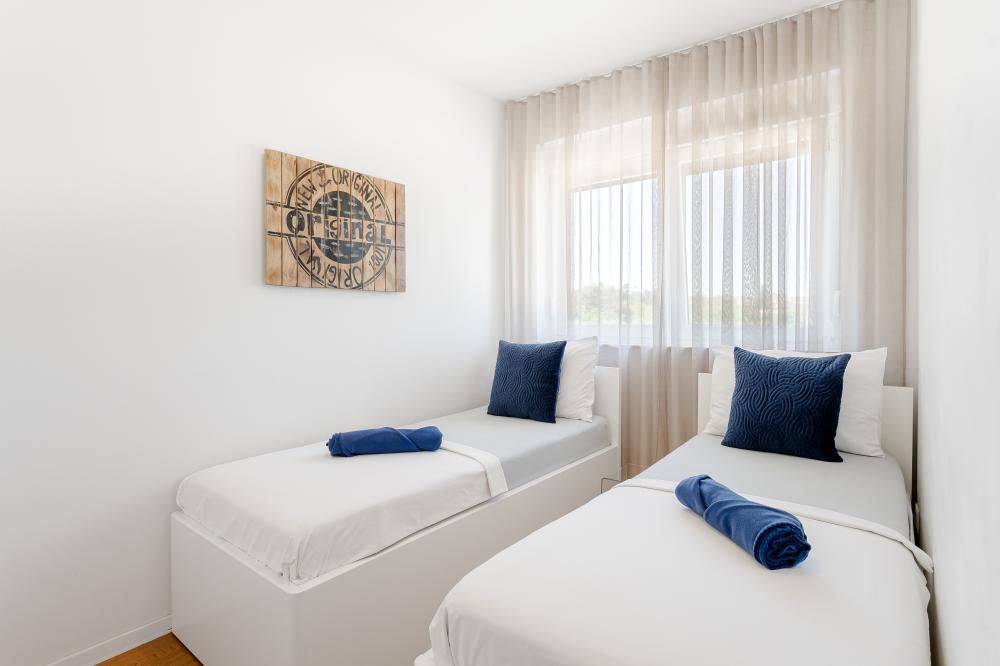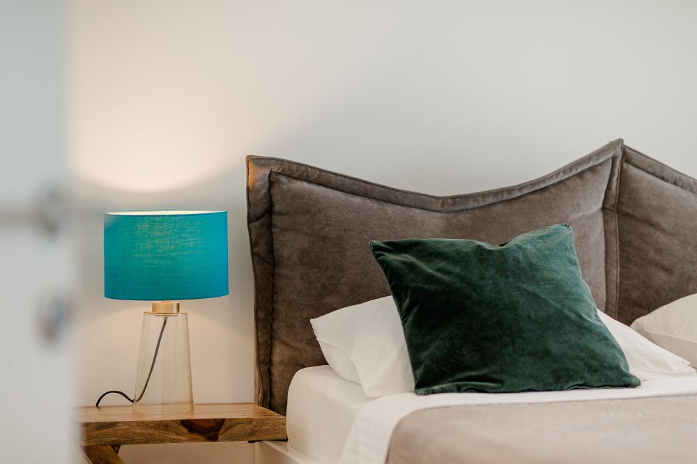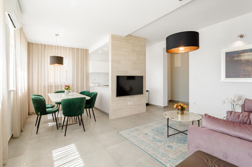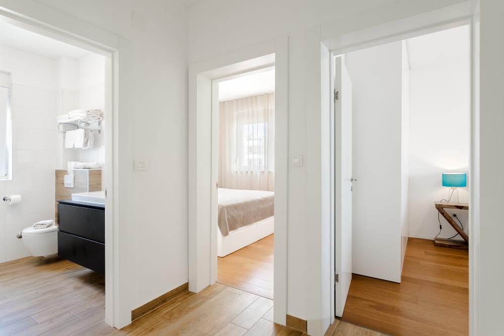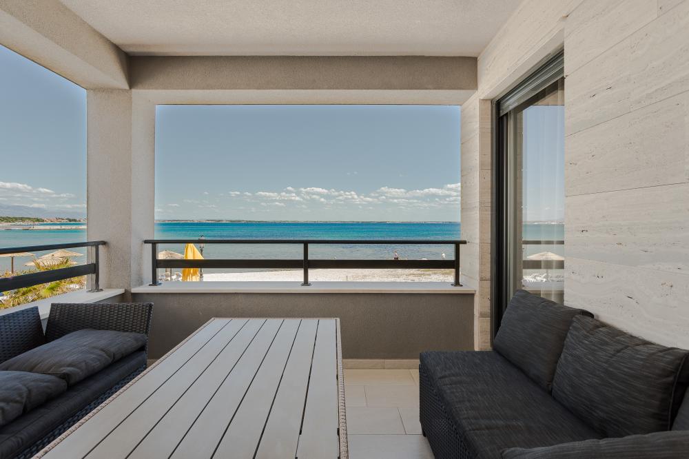 Tříložnicové apartmány jsou umístěny v 1. patře a mají vlastní terasu s venkovním posezením a výhledem na moře.