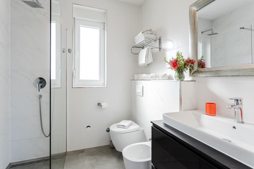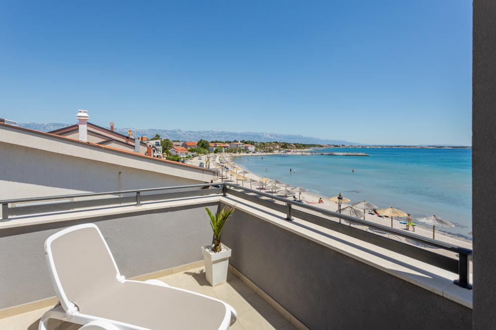 Dvouložnicové apartmány jsou umístěny ve 2. patře a mají velkou terasu s lehátky, venkovním posezením a výhledem na moře.