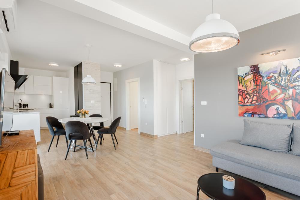 Apartmán se skládá ze dvou samostatných ložnic (jedna s manželskou postelí, druhá s oddělenými jednolůžkovými postelemi), z koupelny s toaletou a sprchovým koutem, a prostorné místnosti, která slouží zároveň jako kuchyňský, jídelní a obývací kout. K dispozici je plně vybavená kuchyň, jídelní stůl a židle, rozkládací pohovka (která v případě potřeby slouží jako přistýlka) a TV.