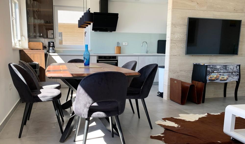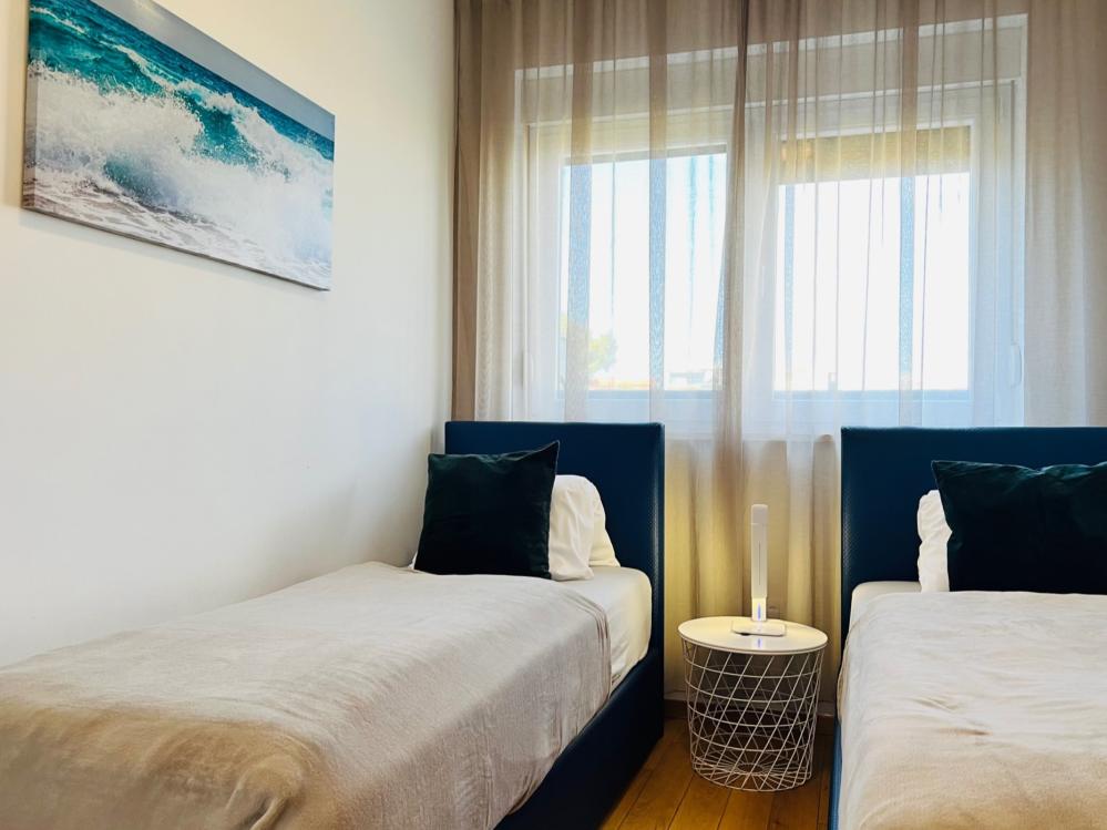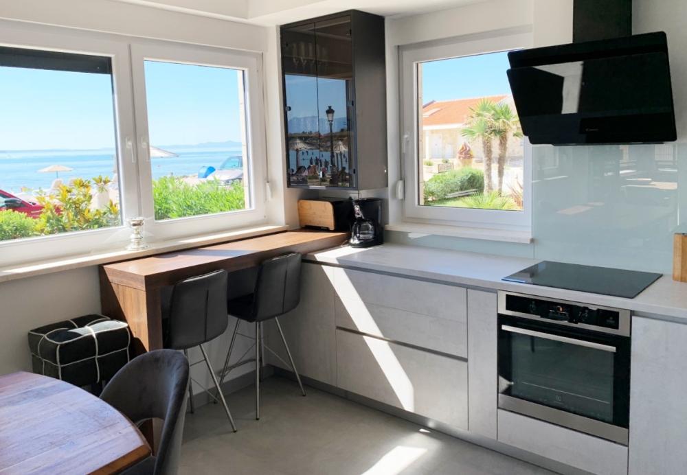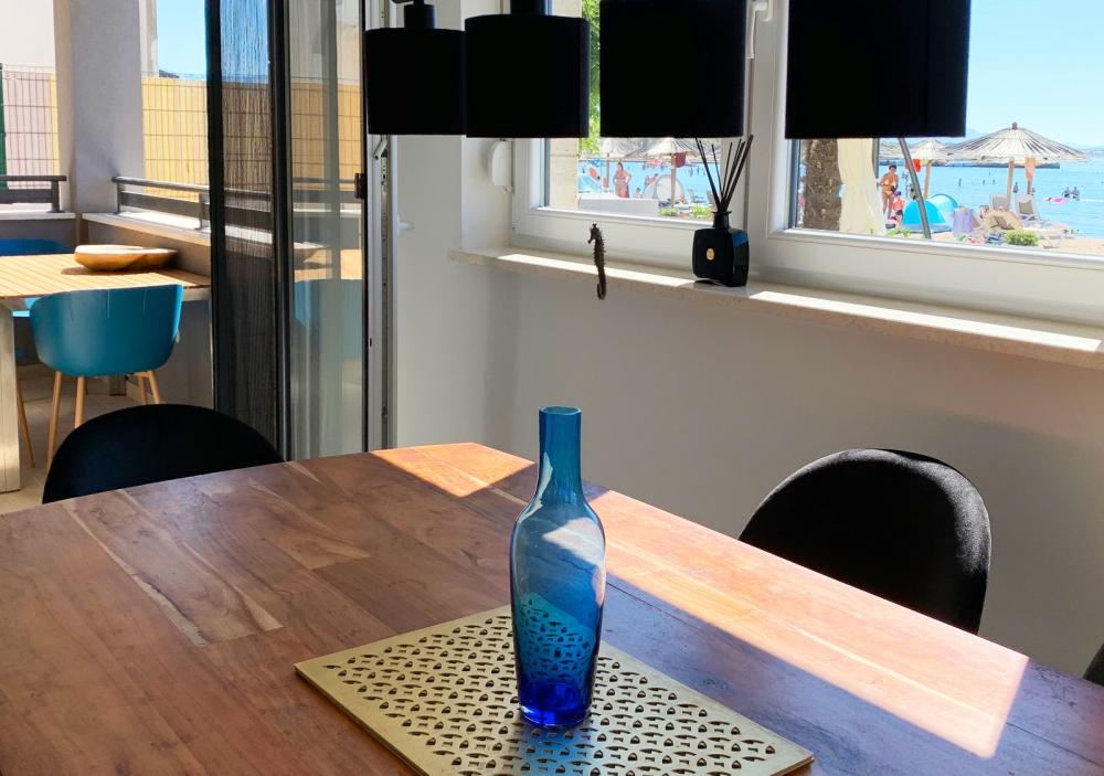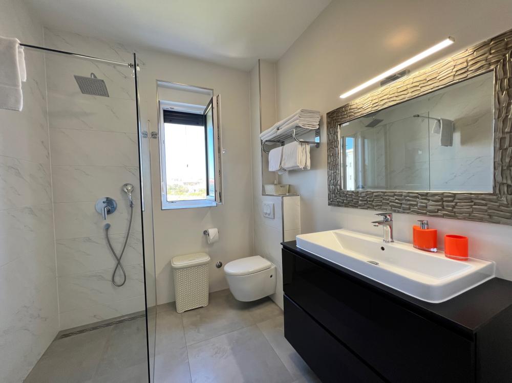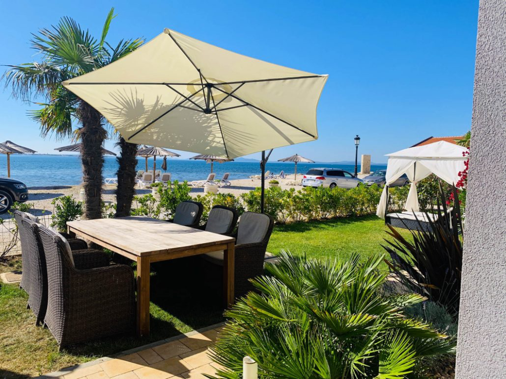 Tento tříložnicový apartmán se nachází v přízemí a má nejen vlastní terasu, ale i zahradu s venkovním posezením a výhledem na moře.