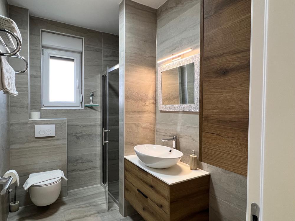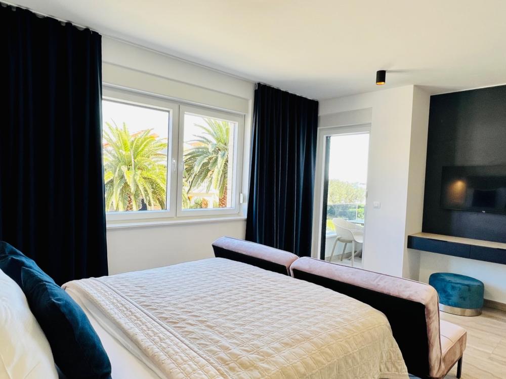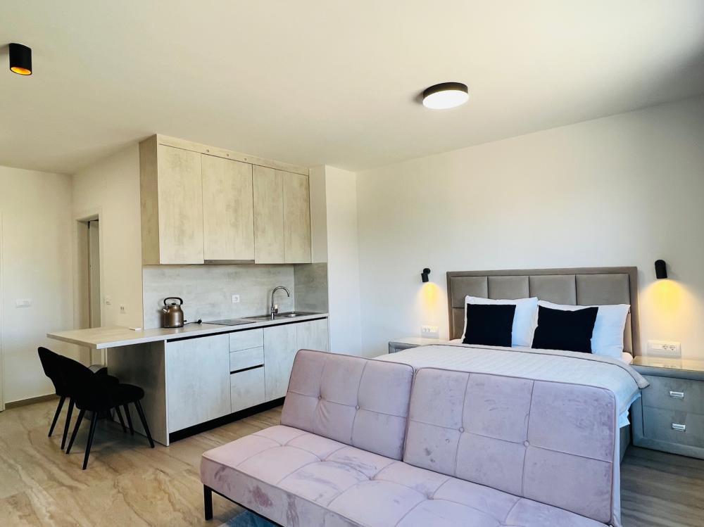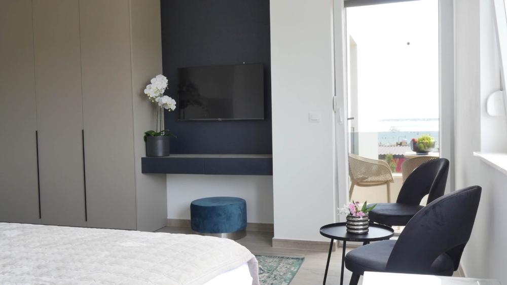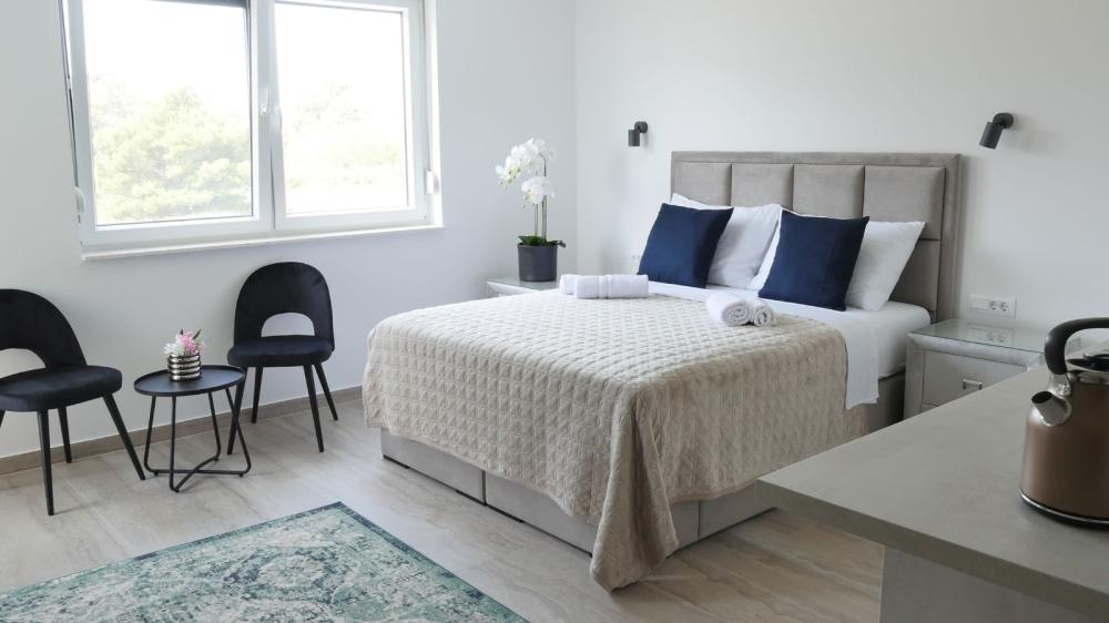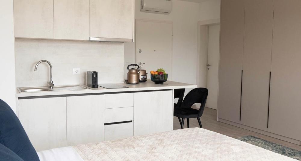 Studio se nachází v 1. a 2. patře domu a skládá se z jedné prostorné místnosti, která nabízí vše potřebné k dovolené ve dvou. Pokoji dominuje manželská postel s kvalitní matrací a lůžkovinami, která je umístěna hned naproti designové stěně s televizí. K dispozici je plně vybavená kuchyňka s jídelním koutem, který může sloužit i jako plnohodnotný pracovní prostor. Koupelna je vybavena sprchovým koutem, toaletou a úložným prostorem. Studio má vlastní balkón s venkovním posezením a výhledem na moře.