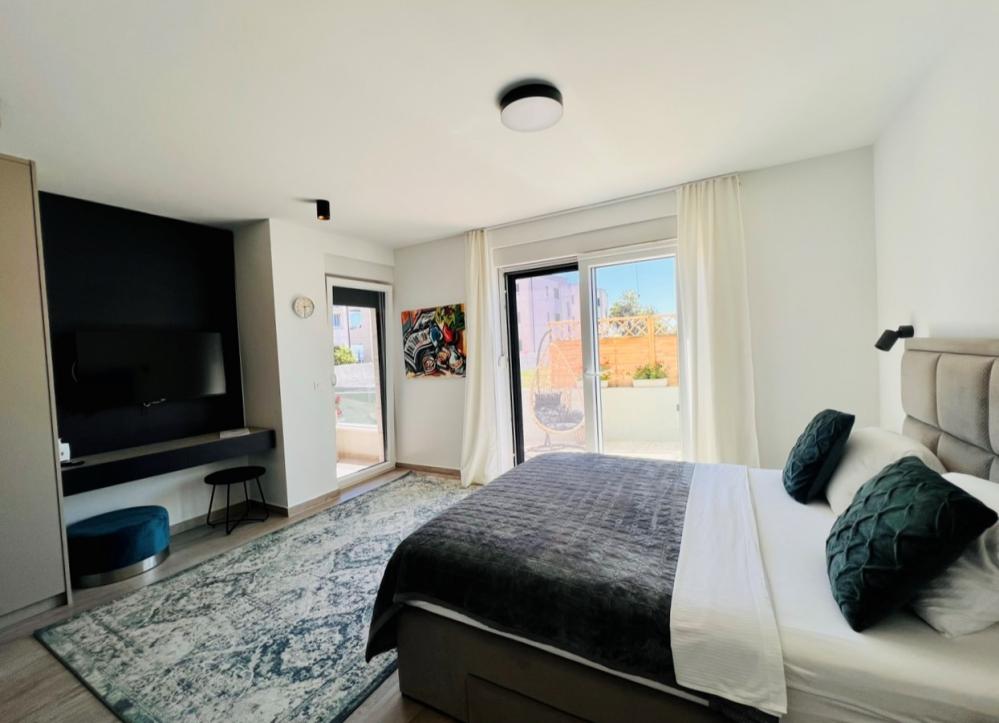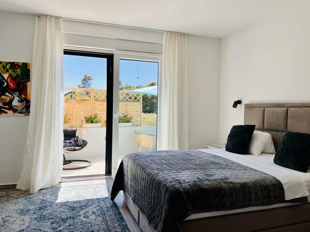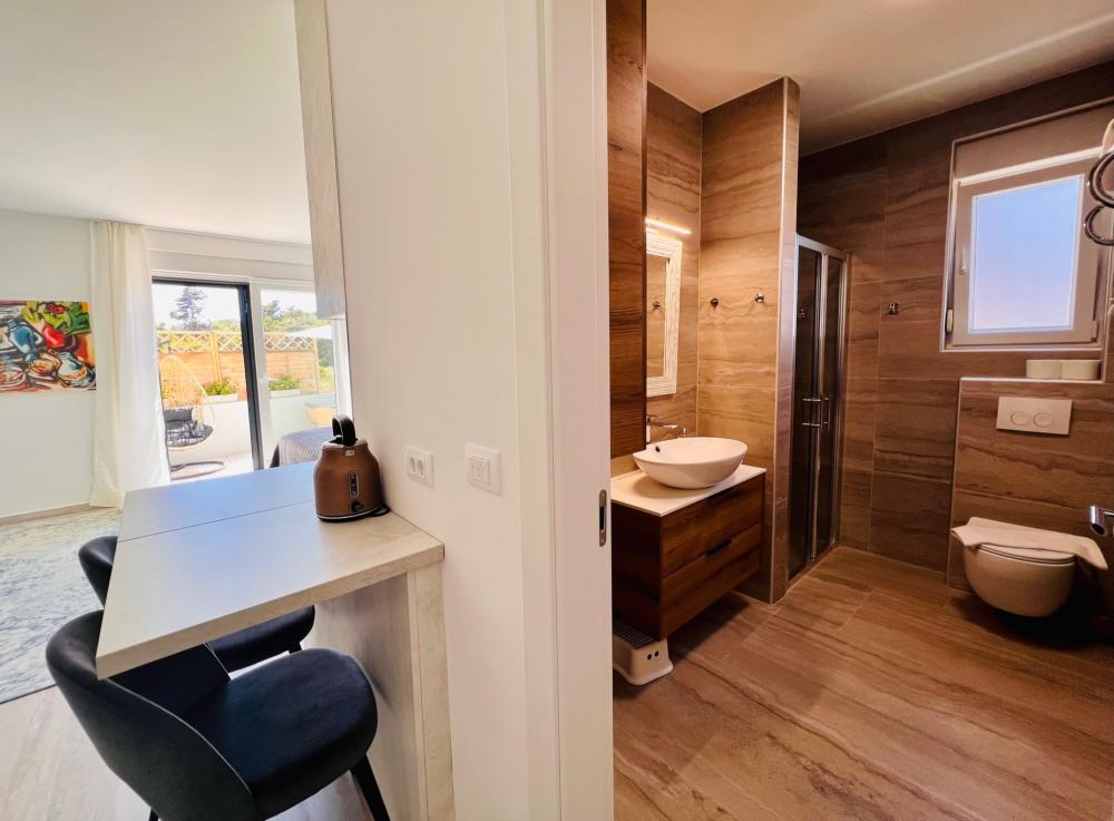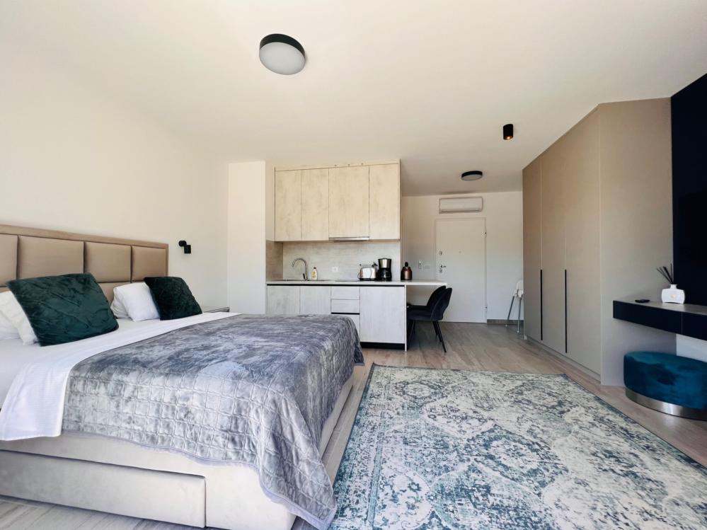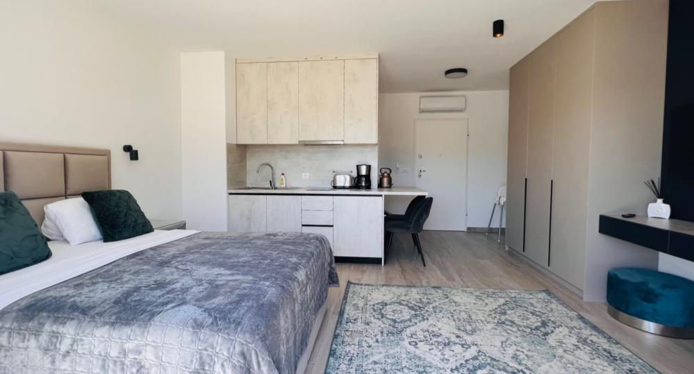 Studio hotelového typu se nachází v přízemí a skládá se z jedné prostorné místnosti, která nabízí vše potřebné k dovolené ve dvou. Pokoji dominuje manželská postel s kvalitní matrací a lůžkovinami, která je umístěna hned naproti designové stěně s televizí. K dispozici je plně vybavená kuchyňka s jídelním koutem, který může sloužit i jako plnohodnotný pracovní prostor. Koupelna je vybavena sprchovým koutem, toaletou a úložným prostorem. Přímo z pokoje vede vstup na terasu a menší zahradu s venkovním posezením.