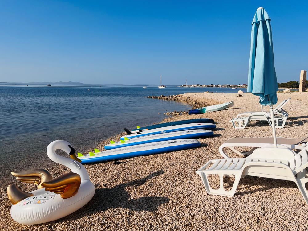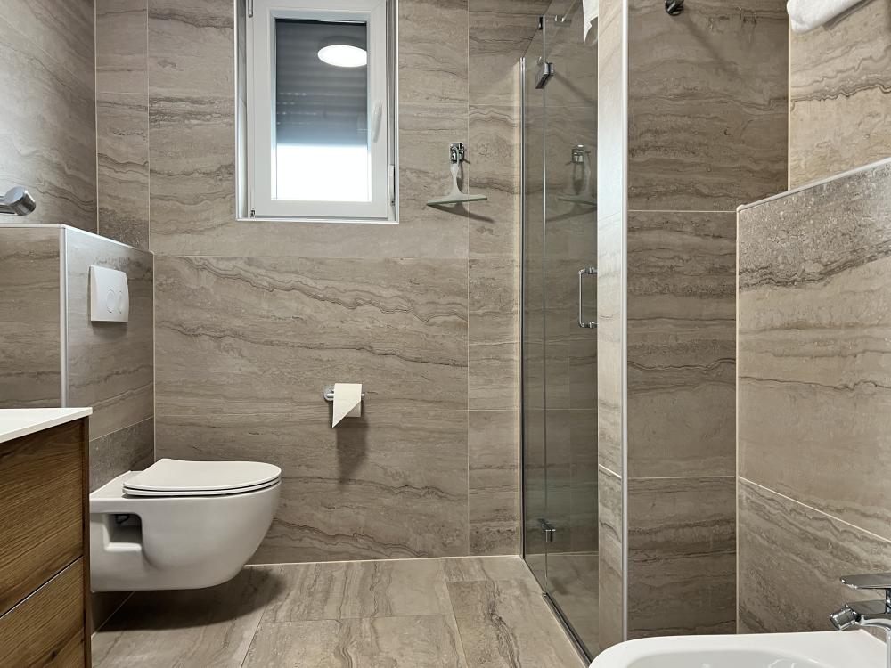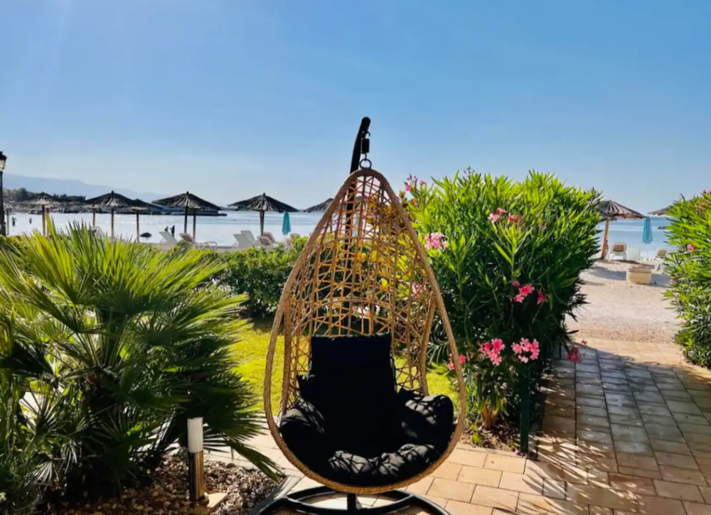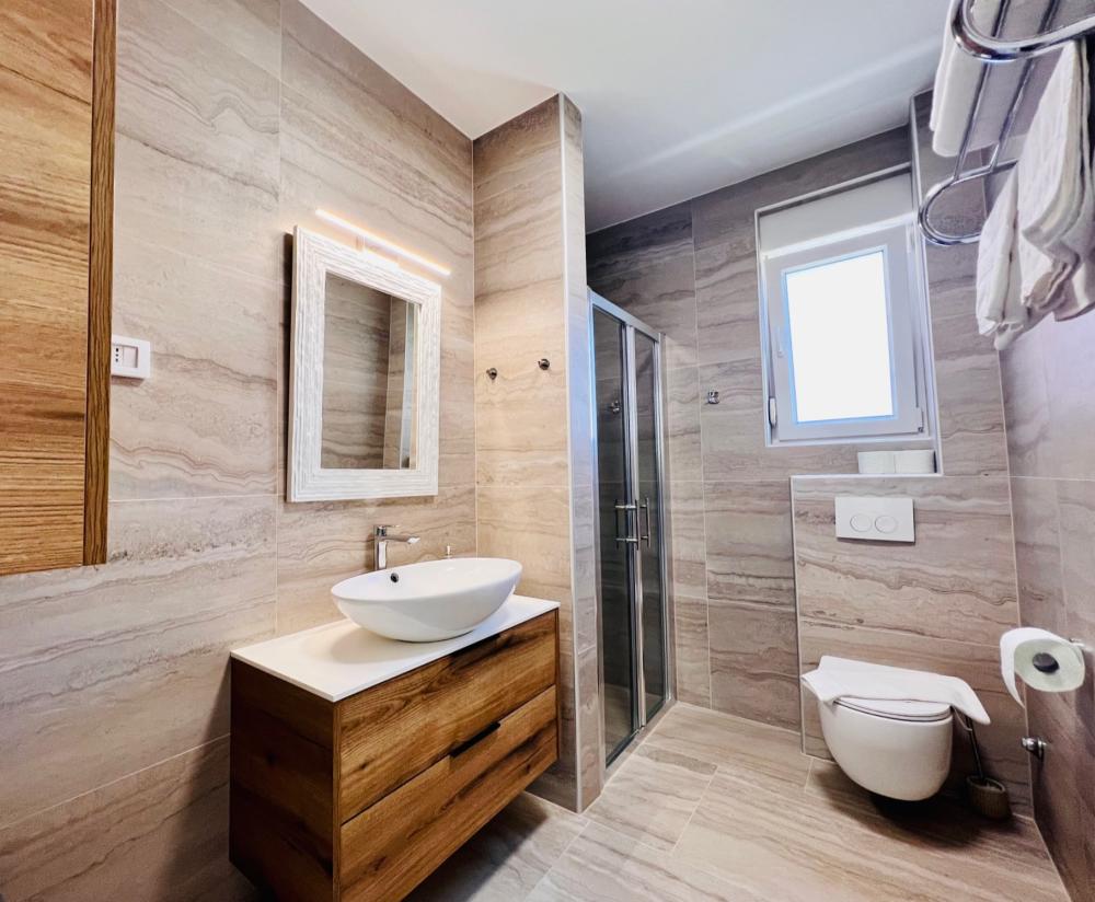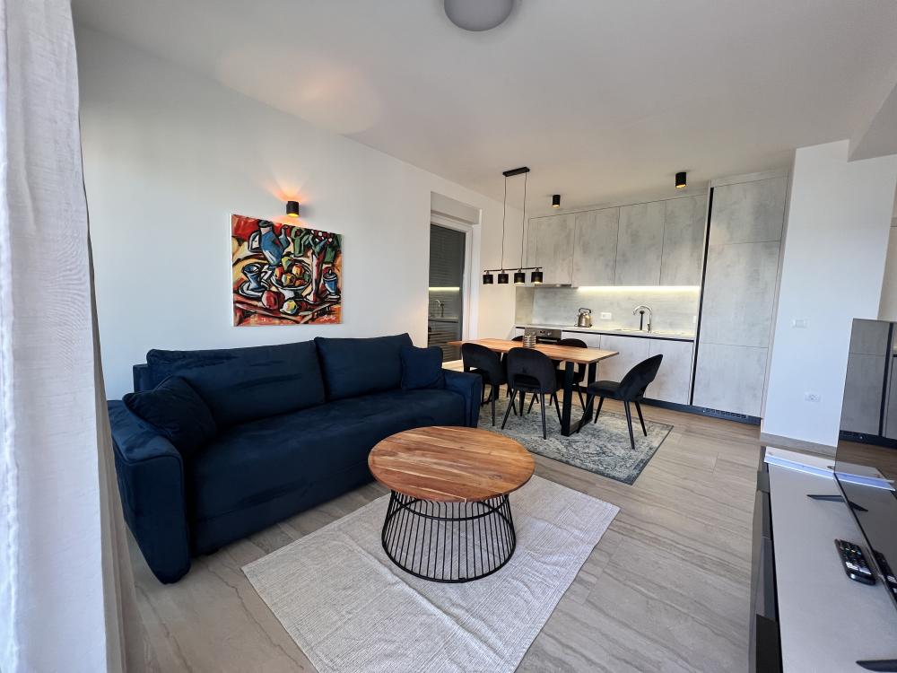 Apartmán se skládá z ložnice s manželskou postelí, která je oddělena dveřmi, z koupelny s toaletou a sprchovým koutem, a prostorné místnosti, která slouží zároveň jako kuchyňský, jídelní a obývací kout. K dispozici je plně vybavená kuchyň, jídelní stůl a židle, rozkládací pohovka (která v případě potřeby slouží jako přistýlka) a TV. Apartmán se nachází v přízemí a z obývacího pokoje vede přímý vstup na terasu s menší zahradou a venkovním posezením.